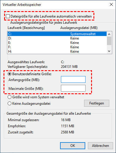 Schritt 5. Deaktivieren Sie „Dateigröße für alle Laufwerke automatisch verwalten“ und geben Sie eine neue Größe in Megabyte in „Anfangsgröße“ und „Maximale Größe“ ein.
