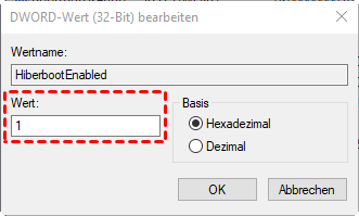 Schritt 3: Ändern Sie in dem sich öffnenden Dialog „DWORD-Wert (32-Bit) bearbeiten“ dessen Wert auf 1 und klicken Sie auf OK, um den schnellen Start in Windows 10 zu aktivieren.