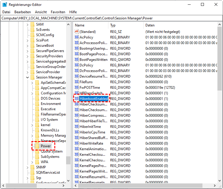 Schritt 2: Navigieren Sie zu HKEY_LOCAL_MACHINE\SYSTEM\CurrentControlSet\Control\SessionManager\Power. Suchen Sie den Schlüssel HiberbootEnabled im rechten Bereich und doppelklicken Sie darauf.