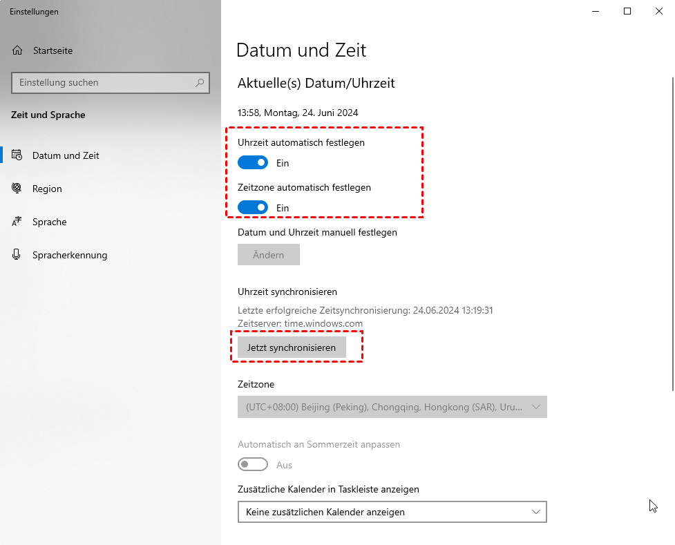 Schritt 2. Aktivieren Sie die Optionen „Uhrzeit automatisch festlegen“ und „Zeitzone automatisch festlegen“. Klicken Sie dann auf „Jetzt synchronisieren“.