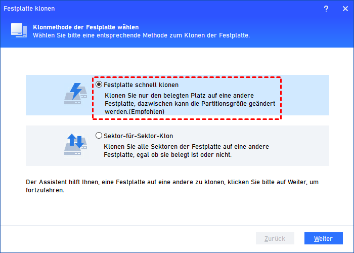 Schritt 2. Wählen Sie im Pop-up-Fenster Festplatte schnell klonen. Wenn Sie eine Festplatte mit fehlerhaften Sektoren klonen müssen und die Kapazität der Ziel-SSD nicht kleiner ist als die der Quellplatte, wählen Sie bitte Sektor-für-Sektor-Klon.