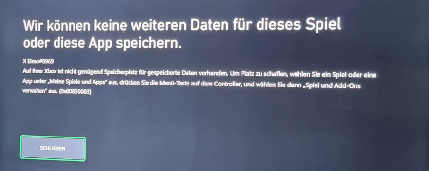 Fehler 0x80830003 tritt auf, wenn ich versuche, Spiel- oder App-Daten auf meine Xbox-Konsole zu speichern! Es zeigt auch die Meldung „Wir können keine weiteren Daten für dieses Spiel oder diese App speichern“ an. Dies passiert bei ALLEN Spielen, ich kann keine Spiele in der Cloud speichern und oft kann ich meine gespeicherten Daten nicht von der Cloud abrufen. Ich habe bereits vollständige Zurücksetzungen durchgeführt und lokale gespeicherte Spiele gelöscht usw. Kann mir jemand helfen???