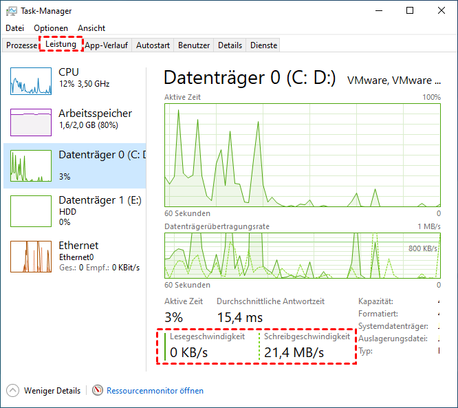 Hinweis: Der Task-Manager zeigt nur die grundlegenden Geschwindigkeitsinformationen an, und die Zahl ändert sich sogar, was davon abhängt, welche Programme Sie im Hintergrund ausführen. Daher ist es schwierig, den tatsächlichen Zustand Ihrer Festplatte zu ermitteln.