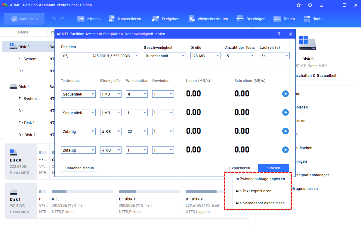 Schritt 3. Wählen Sie in der linken Spalte die Festplatte aus, die Sie testen möchten. Unten werden die Lese- und Schreibgeschwindigkeiten angezeigt.