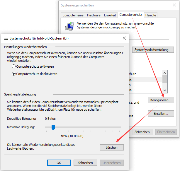 Methode 1. Alte Wiederherstellungspunkte löschen über die Systemwiederherstellungseinstellungen