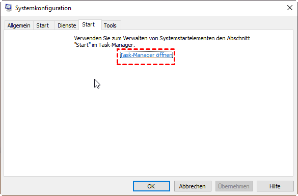 Schritt 2. Gehen Sie im Fenster „Systemkonfiguration“ auf die Registerkarte „Start“ und klicken Sie auf „Task-Manager öffnen“.