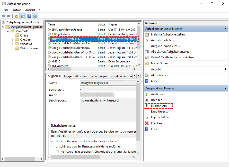 Schritt 2. Suchen Sie die Aufgabe, die für das automatische Löschen oder Leeren des Papierkorbs verantwortlich ist.