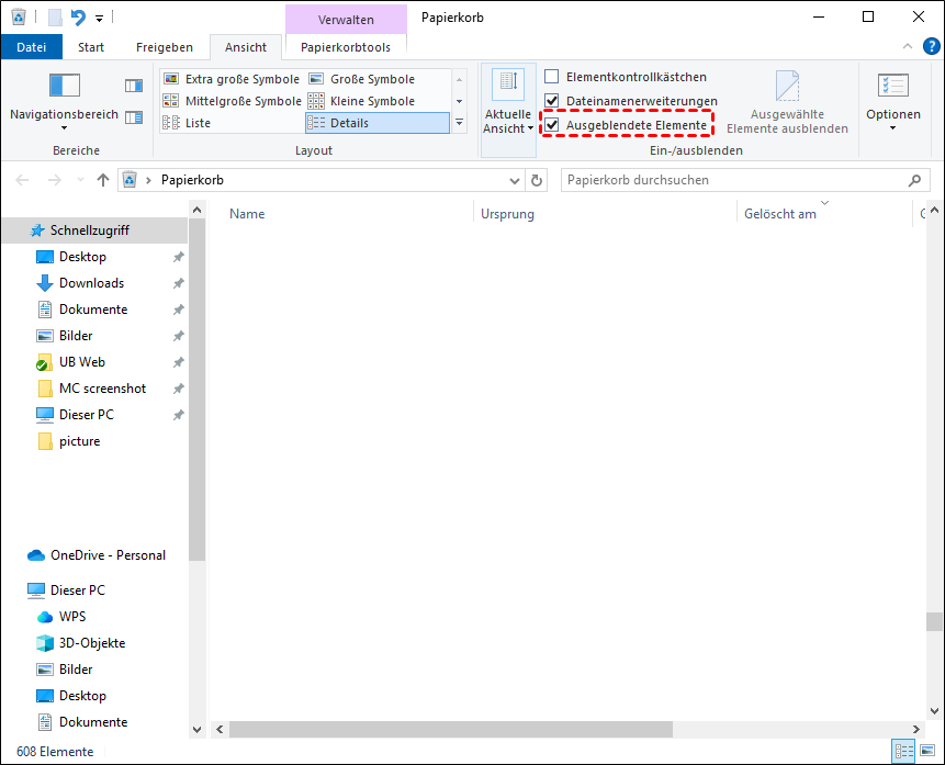 Wenn sich die Dateien immer noch nicht im Papierkorb befinden, wurden sie möglicherweise dauerhaft gelöscht. In diesem Fall fahren Sie mit den nächsten Wiederherstellungsmethoden fort.