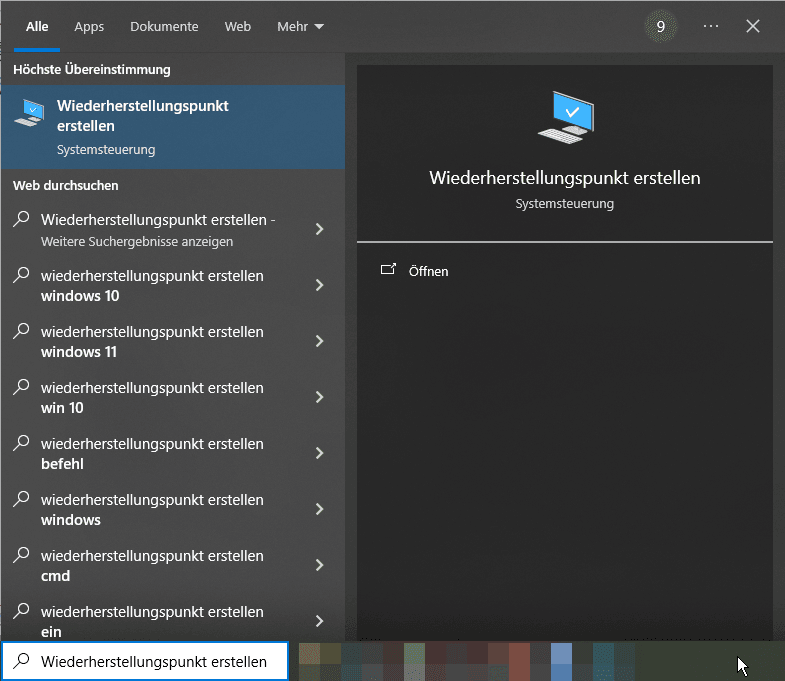 Schritt 1: Geben Sie Wiederherstellungspunkt erstellen im Suchfeld von Windows 10 ein. Klicken Sie in der Liste auf Wiederherstellungspunkt erstellen.