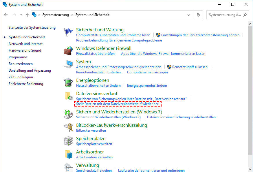 Schritt 1: Gehen Sie zum Bedienfeld und wählen Sie nacheinander Systemsteuerung > System und Sicherheit > Stellt Dateien mit dem Dateiversionsverlauf.