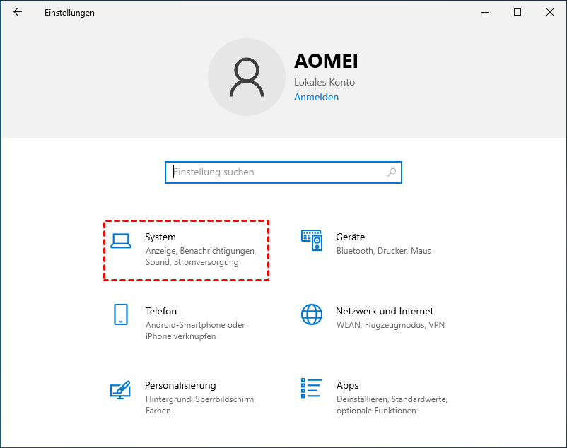 Schritt 1. Klicken Sie auf „Windows“ und wählen Sie „Einstellungen“. Klicken Sie dann im Einstellungsfenster auf „System“.