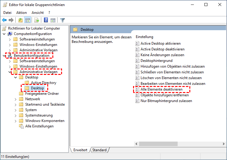 Schritt 2. Suchen Sie „Benutzerkonfiguration“, „Administrative Vorlagen“ und „Desktop“. Doppelklicken Sie dann auf „Alle Elemente deaktivieren“.