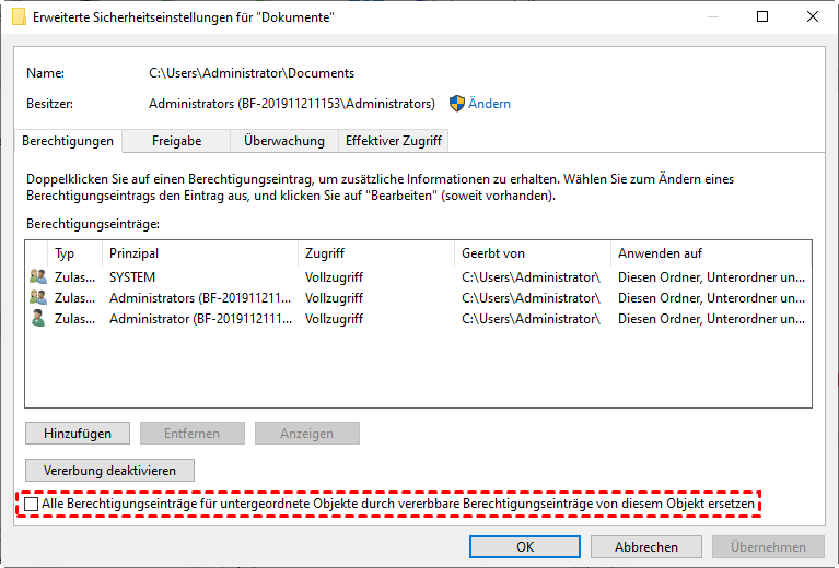 Schritt 4. Gehen Sie zurück zum Fenster „Erweiterte Sicherheitseinstellungen“ und klicken Sie auf die Schaltflächen „Alle Berechtigungseinträge für untergeordnete Objekte durch vererbbare Berechtigungseinträge von diesem Objekt ersetzen“ und „OK“.