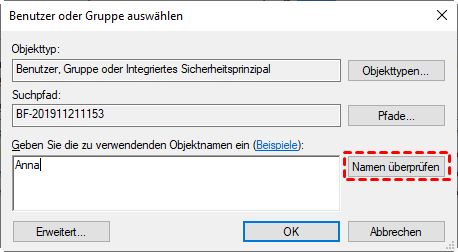 Schritt 3. Geben Sie im Fenster „Benutzer oder Gruppen auswählen“ Ihren Benutzernamen ein, um „Jeder“ zu ersetzen. Klicken Sie dann auf „Namen überprüfen“ > „OK“.