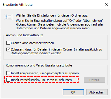 Schritt 2. Aktivieren Sie in der Benutzeroberfläche „Erweiterte Attribute“ nicht die Option „Inhalte verschlüsseln, um Daten zu schützen“ und klicken Sie auf „OK“, um die Änderungen zu speichern.