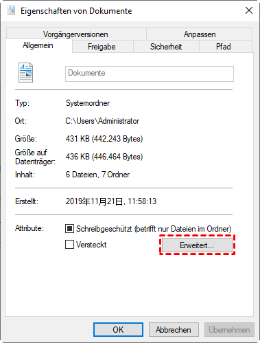 Schritt 1. Drücken Sie Win + E, um den Datei-Explorer zu öffnen > klicken Sie mit der rechten Maustaste auf den Ordner „Dokumente“ > wählen Sie „Eigenschaften“ > klicken Sie auf „Allgemein“ > „Erweitert“.