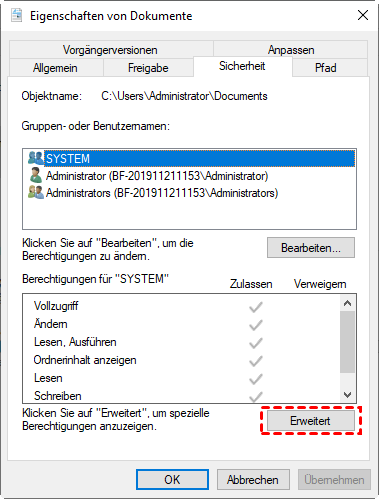 Möglichkeit 2. Systemberechtigungen ändern, um auf Ordner „Dokumente“ und Einstellungen zuzugreifen