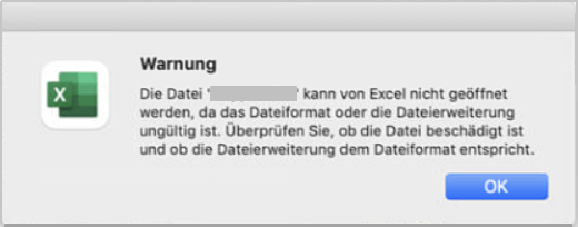 Fehlermeldung: Excel kann die Datei nicht öffnen, da das Dateiformat ungültig ist