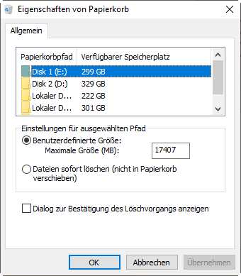 Überprüfen Sie die Einstellungen des Papierkorbs: Klicken Sie mit der rechten Maustaste auf den Papierkorb und wählen Sie „Eigeschaften“. Anschließend prüfen Sie bitte, ob „Dateien sofort löschen (nicht in Papierkorb verschieben)“ aktiviert ist. Wenn dies aktiviert ist, entfernen Sie es.