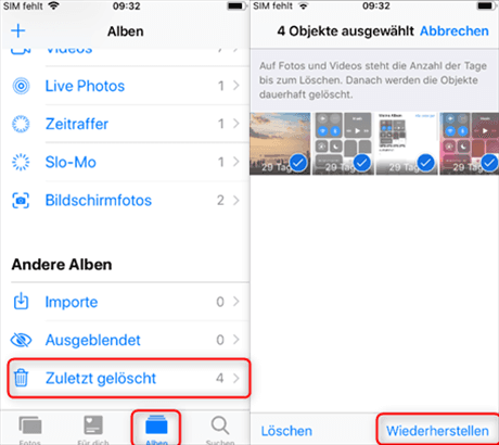 Lösung 1: Fotos über den Ordner „Kürzlich gelöscht" wiederherstellen