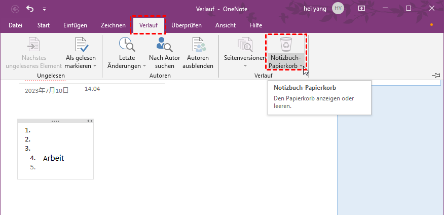 Methode 1. Gelöschte OneNot-Seite wiederherstellen aus Notizbuch-Papierkorb