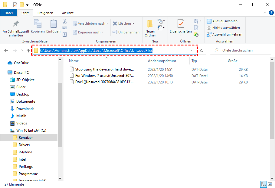Schritt 1. Suchen Sie den Pfad zum Speichern der Datei (z. B.: C:\Benutzer\Benutzername\AppData\Local\Microsoft\Office\UnsavedFiles).