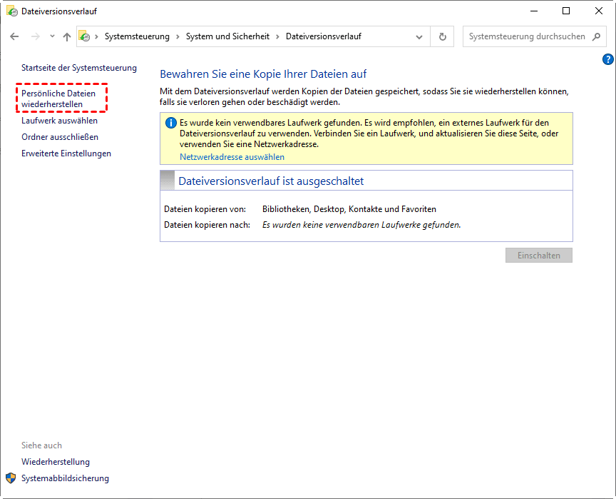 Der Dateiverlauf bewahrt frühere Versionen von Dateien und Ordnern auf, in denen sich das Zieldokument befinden könnte. Sie können überprüfen, ob Sie diese Funktion aktiviert haben, indem Sie zu Systemsteuerung > System und Sicherheit > Dateiverlauf gehen. Wenn dies der Fall ist, können Sie auf Persönliche Dateien wiederherstellen klicken, um die benötigten Dokumente zu finden.