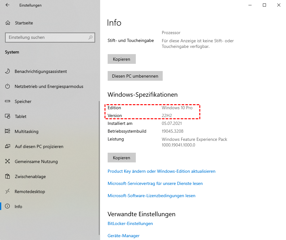 Schritt 1. Überprüfen Sie Ihre Version. Klicken Sie der Reihe nach auf „Einstellungen > System > Info“ und beachten Sie die Windows-Spezifikationen. Wenn die Versionsnummer 2004 oder höher ist, können Sie mit der Nachverfolgung fortfahren.