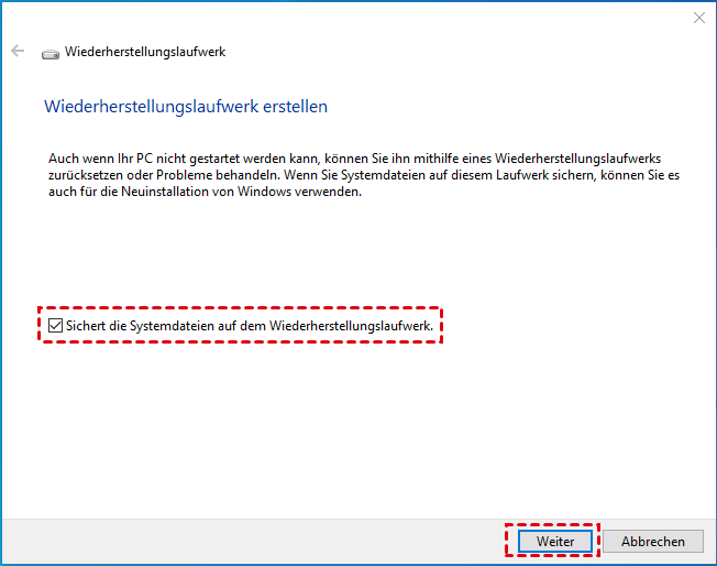 Schritt 3. Ein Fenster wird geöffnet. Sie müssen „Sichert die Systemdateien auf dem Wiederherstellungslaufwerk“ aktivieren und auf „Weiter“ klicken.