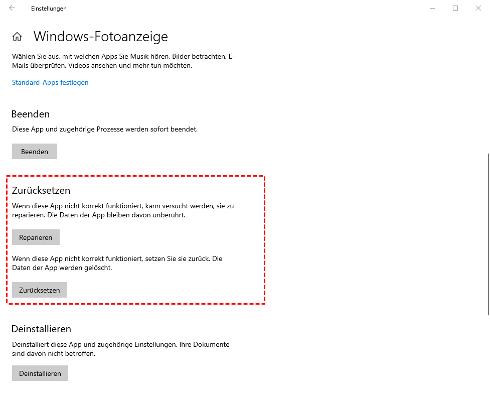 Wenn die Windows-Fotoanzeige immer noch nicht richtig funktioniert, kann das Zurücksetzen der Fotos-App das Problem beheben.