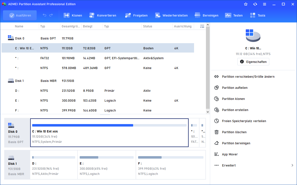 Schauen Sie sich die Hauptoberfläche von AOMEI an. Alle diese Vorgänge können einfach mit AOMEI Partition Assistant Pro durchgeführt werden. Neben Windows 7 werden auch Windows 10, 8.1/8, und Windows 11 unterstützt.