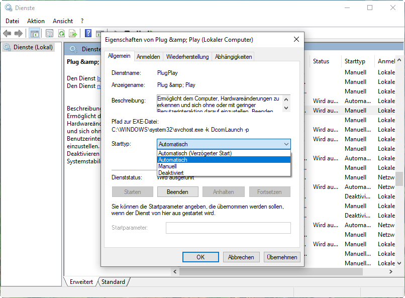 Schritt 2. Suchen Sie die Option „Plug & Play“ und doppelklicken Sie darauf, um die Einstellung zu öffnen. Wählen Sie „Automatisch“ als Starttyp. Klicken Sie auf „OK“, um die Einstellung zu speichern.