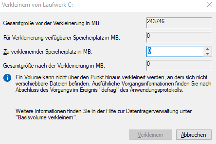 Beim Aufrufen der Windows 10 Datenträgerverwaltung ist die Option „Volume verkleinern“ grau, unabhängig davon, welchen Wert ich in das Feld „Zu verkleinernder Speicherplatz in MB“ eingebe. Die Meldung zeigt, dass ein Volume nicht über den Punkt hinaus verkleinert werden kann, an dem sich nicht verschiebbare Dateien befinden.
