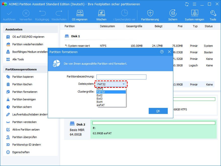 Schritt 3. Sie können die Festplatte auf NTFS, FAT32, Ext4/3/2, exFAT formatieren. Wählen Sie eines der aufgelisteten Dateisysteme aus. Klicken Sie dann auf OK.