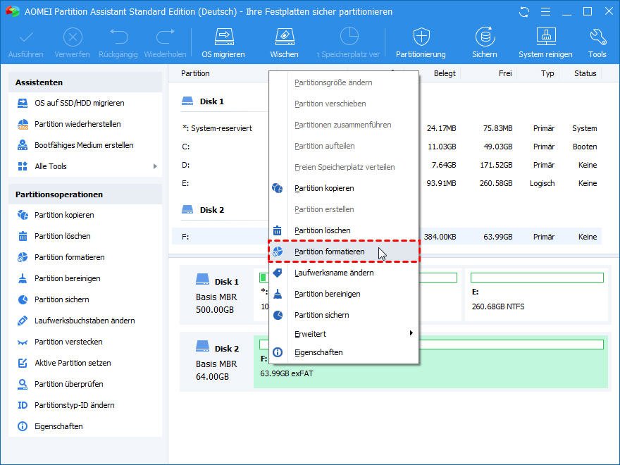 Schritt 2. Klicken Sie mit der rechten Maustaste auf die Festplatte, die Sie formatieren möchten, und wählen Sie Partition formatieren.