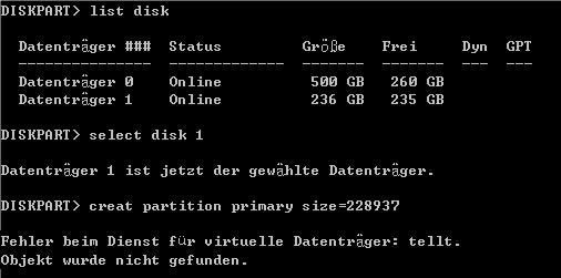 „Ich habe sie auf MBR initialisiert, als sie zum ersten Mal von Windows erkannt wurde. Ich möchte eine primäre Partition auf meiner 250GB Festplatte erstellen. In Diskpart habe ich die folgenden Befehle zum Erstellen einer Partition eingegeben: list disk -> select disk 1 -> create partition primary size = 228937. Und dann erhalte ich die Fehlermeldung - Fehler beim Dienst für virtuelle Datenträger: Objekt wurde nicht gefunden, wie im folgenden Bild gezeigt. Warum kann ich keine Partition auf dieser Festplatte erstellen? Was ist die einfachste Methode, um dieses Problem zu lösen?“