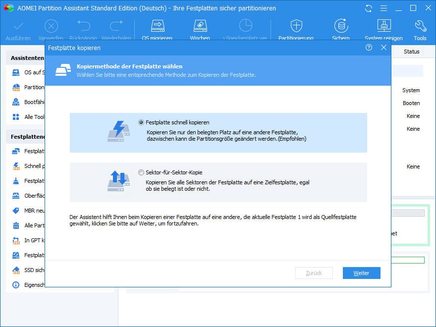 Die oben genannte Software, AOMEI Partition Assistant Standard, ist ebenfalls eine leistungsstarke Festplatte Klonen Software. Es bietet zwei verschiedene Kopiermethoden, Sektor-für-Sektor Klonen und intelligentes Klonen, mit denen Sie problemlos große Festplatte auf eine kleinere klonen können. Lass uns genauer hinsehen.