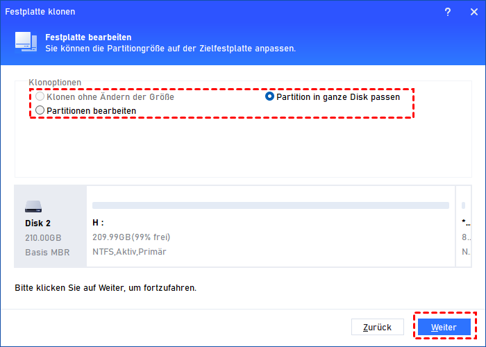 5. Auf dieser Seite können Sie die Partitionsgröße anpassen. Beachten Sie, dass dieser Schritt übersprungen wird, wenn Sie im Schritt 3 die zweite Kopiermethode Sektor-für-Sektor-Klon ausgewählt haben. Wenn Sie große Festplatte auf kleinere Festplatte klonen, ist die Kopieroption „Klonen ohne Ändern der Größe“ ausgegraut.