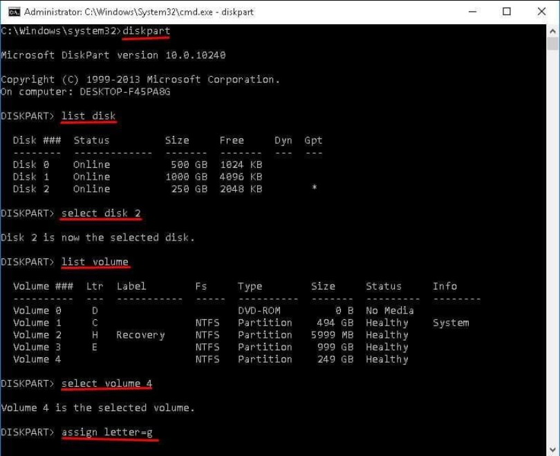 Wenn es auf den Verlust des Laufwerksbuchstabens zurückzuführen ist, können Sie die gelöschte Partition mit CMD wiederherstellen, indem Sie einen Laufwerksbuchstaben zuweisen.