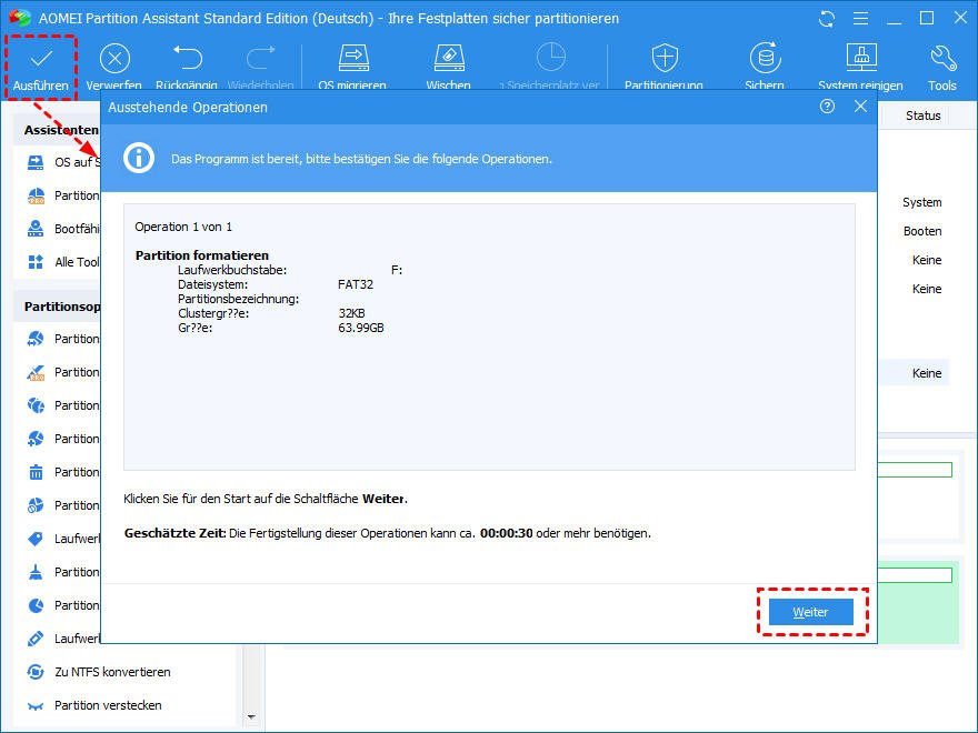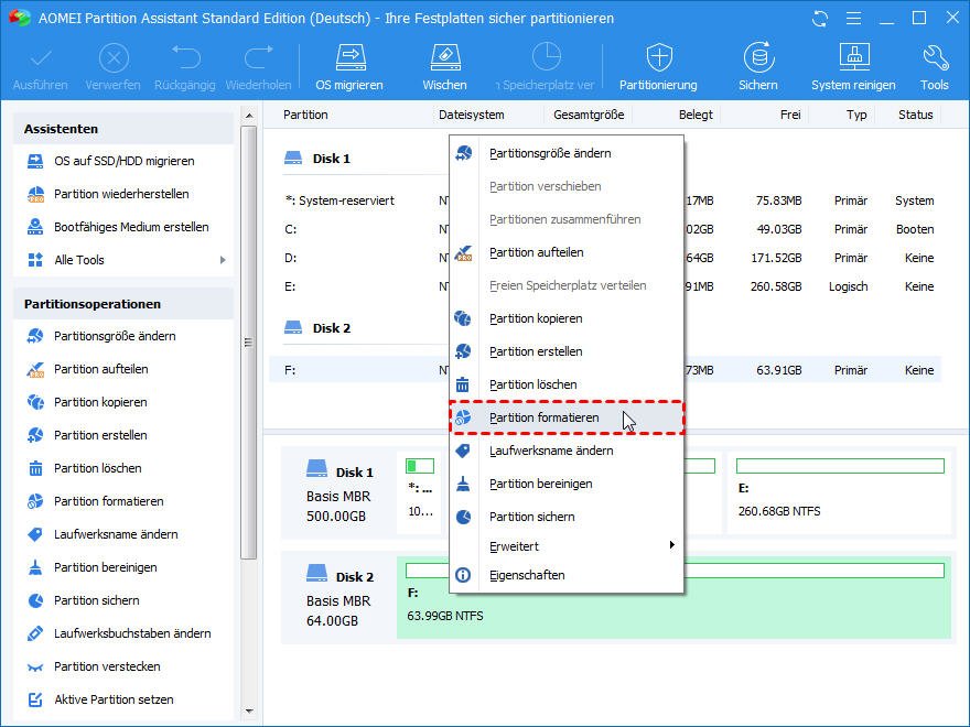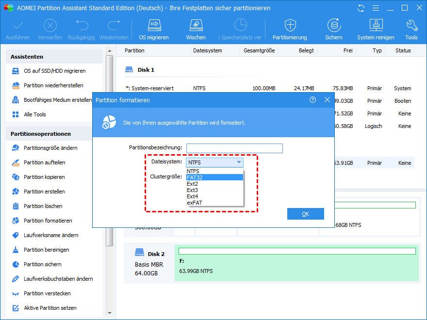 Wenn Sie bestimmt sind, die Festplatte größer als 32 GB auf FAT32 zu formatieren, sehen Sie unten und lösen Sie das Problem mit AOMEI Partition Assistant.