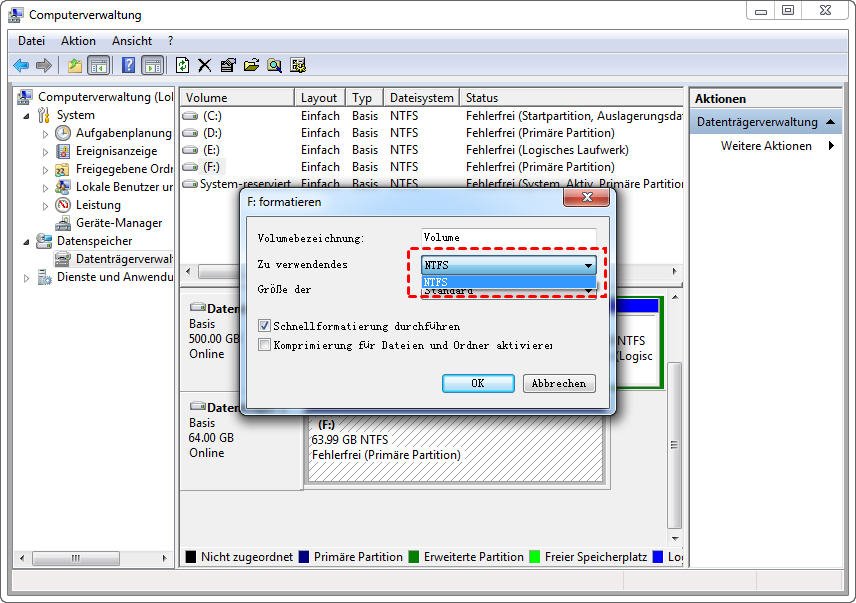 Wenn Sie versuchen, eine mehr als 32 GB Festplatte mit der Datenträgerverwaltung zu formatieren, können Sie nur NTFS im Dropdown-Menü des Dateisystems sehen. Wenn Sie jedoch eine Festplatte kleiner als 32 GB formatieren, können Sie sowohl das NTFS- als auch das FAT32-Dateisystem sehen. Das heißt, Sie können die Datenträgerverwaltung noch nicht verwenden, um dieses Problem zu beheben.