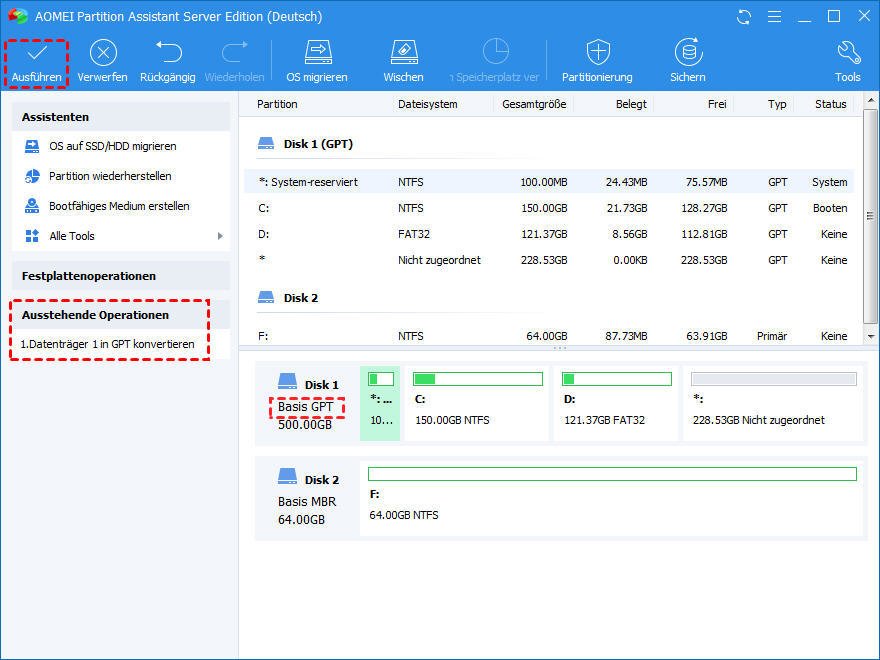 Um diese Probleme zu lösen, empfehle ich Ihnen den AOMEI Partition Assistant. Dies ist ein leistungsfähiger MBR-zu-GPT-Konverter, der eine gute Alternative für DiskPart sein kann. Mit ihm können Sie MBR in GPT konvertieren, ohne die Daten zu löschen, und umgekehrt. Noch wichtiger ist, dass seine Bedienung sehr einfach ist, es braucht nur 3 Schritte, um die Konvertierung zu erreichen.