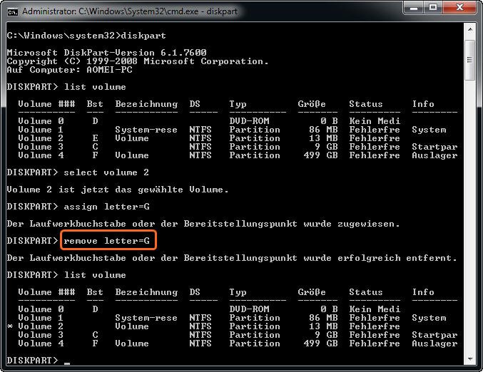 Hinweis: Wenn Sie den Laufwerkbuchstabe mit Diskpart entfernen, geben Sie „remove letter=G“ ein.