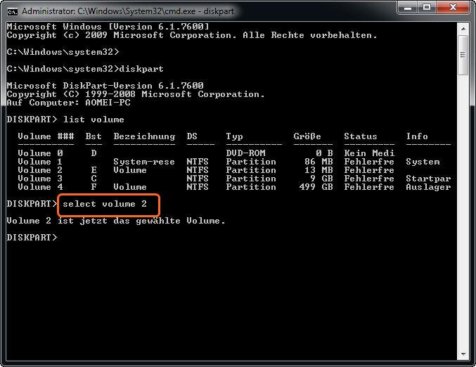 Jetzt haben Sie den Laufwerkbuchstaben schon zugeordnet, geändert, oder entfernt. Und Sie können Sie „list volume“ eingeben, um die Details zu sehen.