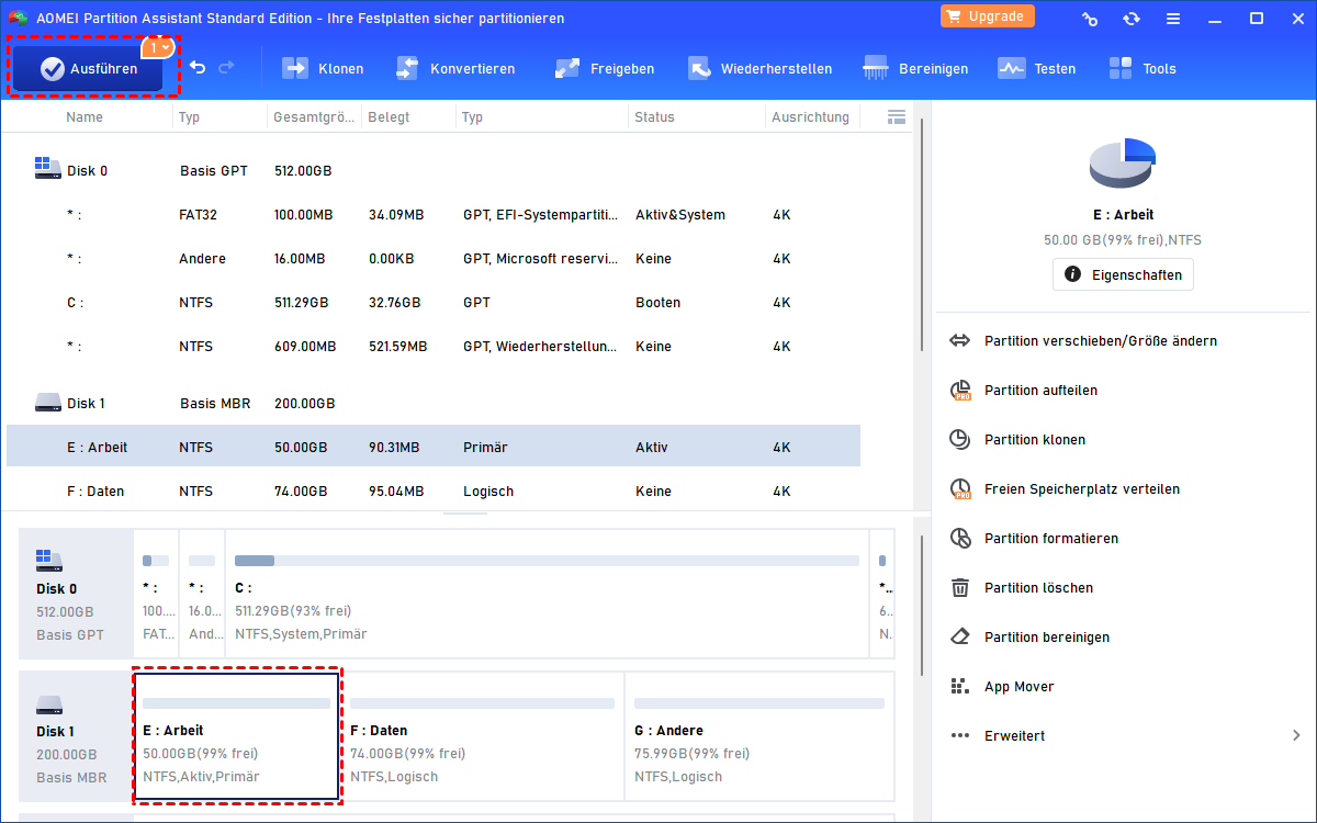 AOMEI Partition Assistant Standard Edition ist ein völlig kostenloser Partitionsmanager eines Drittanbieters. Er unterstützt Benutzer bei der Zuweisung von Laufwerksbuchstaben durch eine freundlichere Oberfläche, die mit nur wenigen Klicks erledigt werden kann, viel einfacher als Diskpart. Außerdem kann er Laufwerksbuchstaben für jedes Dateisystem zuweisen. Noch wichtiger ist, dass er über umfassendere Funktionen verfügt und es Ihnen ermöglicht, Festplatten flexibel zu verwalten.