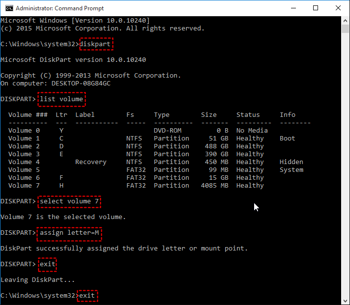 Tatsächlich können Sie Laufwerksbuchstabe ändern, wenn Sie eine neue erstellen. Dafür müssen Sie erst eine Partition erstellen. Geben Sie nach dem Erstellen der Partition „assign letter =?“ zu dieser Partition ein. Oder, wenn es ein verstecktes Volume gibt, wird es keinen Laufwerkbuchstaben haben. Um es zu zeigen, müssen Sie einen Laufwerksbuchstaben für es zuweisen.