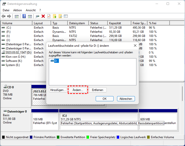 Hinweis: Wenn Sie den Laufwerksbuchstaben entfernen möchten, können Sie „Entfernen“ wählen und den Anweisungen Schritt für Schritt folgen.