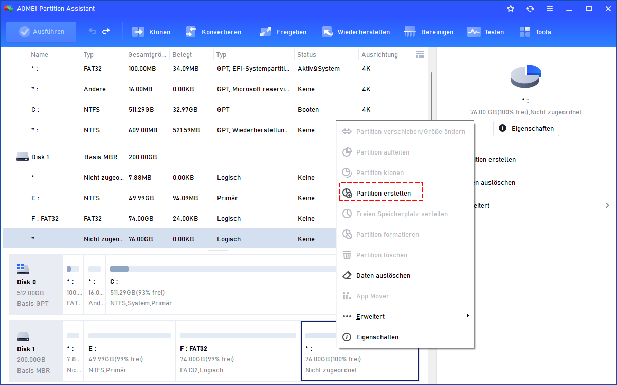 AOMEI Partition Assistant bietet Ihnen eine grafische Benutzeroberfläche (GUI), um Festplatten zu partitionieren. Sie können Sie es verwenden, um eine Partition auf einer vorhandenen Partition oder einen nicht zugewiesenen Speicherplatz zu erstellen. Mit der intuitiven Benutzeroberfläche sollte das Erstellen von Partition für Computer sehr einfach sein, dass auch eine Laie allein arbeiten kann.