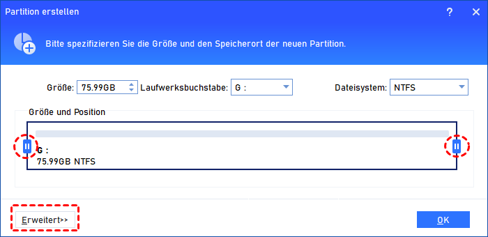 Schritt 3. Nachdem Sie auf „Partition erstellen“ geklickt haben, wird ein Fenster angezeigt, in dem Sie die Partitionsgröße ändern können, und dann klicken Sie auf „OK“.