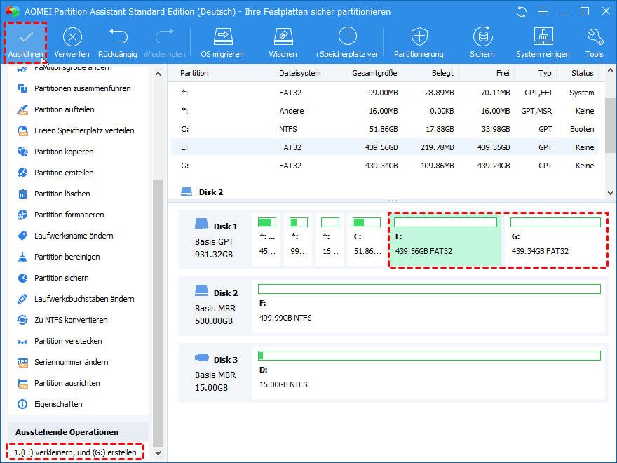 Schritt 4. Jetzt können Sie eine Vorschau der Änderung Ihrer Festplatte in der Hauptschnittstelle sehen. Vergessen Sie nicht, in der Symbolleiste auf „Ausführen“ zu klicken, um alle Operationen einzureichen.